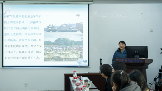 机械设计制造及其自动化教研室于玲老师做了“以OBE为导向的《液压与气压传动》一流课程建设”报告。《液压与气压传动》以OBE为导向,以企业需求反向设定教学目标,在课程教学过程中,以项目导入,凝练新知,激发学生学习兴趣,自然融入思政要素,对学生进行精神引领,培养学生民族自豪感,坚定“文化自信”,激发学生民族责任感、爱国精神。