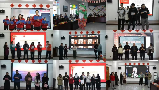 学院党委领导班子致辞,对全体教师过去一年来辛勤的付出表达由衷的感谢,并对下一年度工作提出新的要求。各教研室纷纷以视频的形式展示过去一年来各项工作的成果,同时以精彩纷呈的节目表达对新春的美好祝福。游戏“蒙眼喂食”“你比我猜”环节中,老师们两两自由组队,在游戏的重重考验中充分展现出惊人的默契,将活动逐渐推向白热化。
